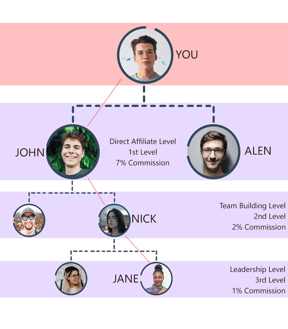 10.1 - Example: As you already know, Mr. JOHN was your Reffered Member. Now JOHN Reffered new member 'Mr. NICK' and NICK Activated his account and ordered new plan or joined Corporate. So, you will get Commissions from 'NICK via JOHN' as it is under your Team. SEE FAQ # 12 FOR DETAIL DIAGRAM.