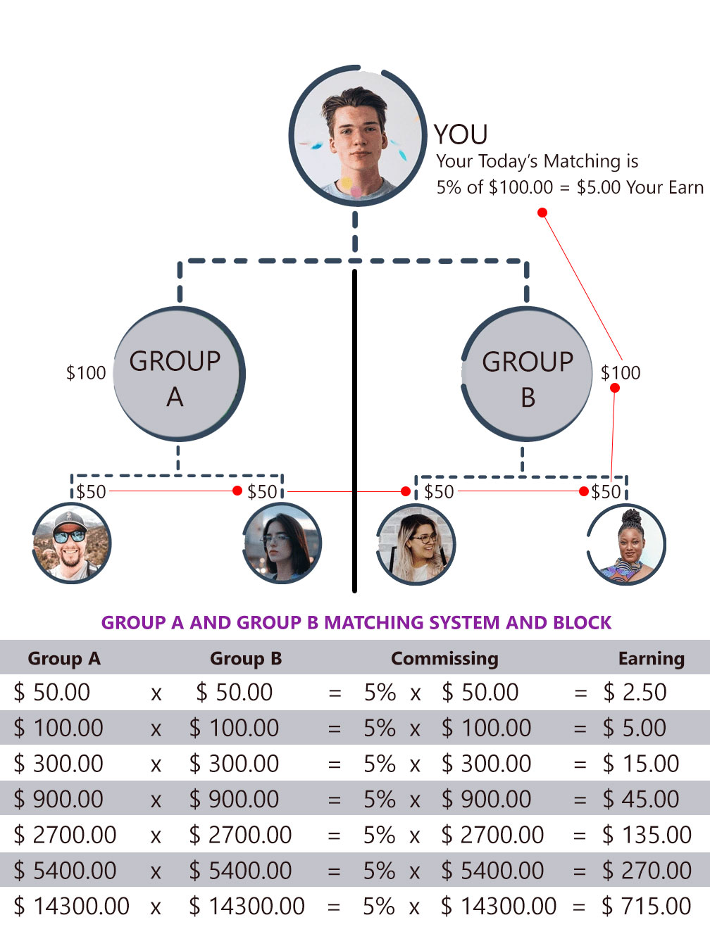 13.0 - If your reffered members works togather and generate leads and if their leads balance your earning cap in Group A and Group B, then you will get 5% Group Matching Commission.